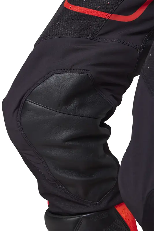 • Double-layer knee system with a full-grain leather outer and abrasion-resistant inner layer provides increased durability against knee braces, guards, and the bike
