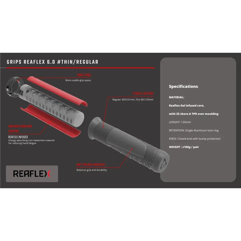 - The grip core is infused with our energy-absorbing non-newtonian Reaflex gel, noticeably reducing vibrations transmitted to the rider, thus reducing hand fatigue and arm pumps.