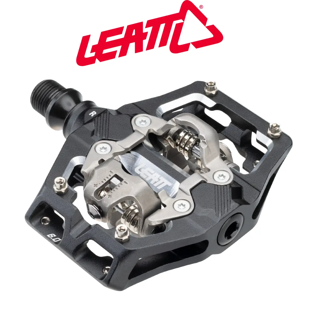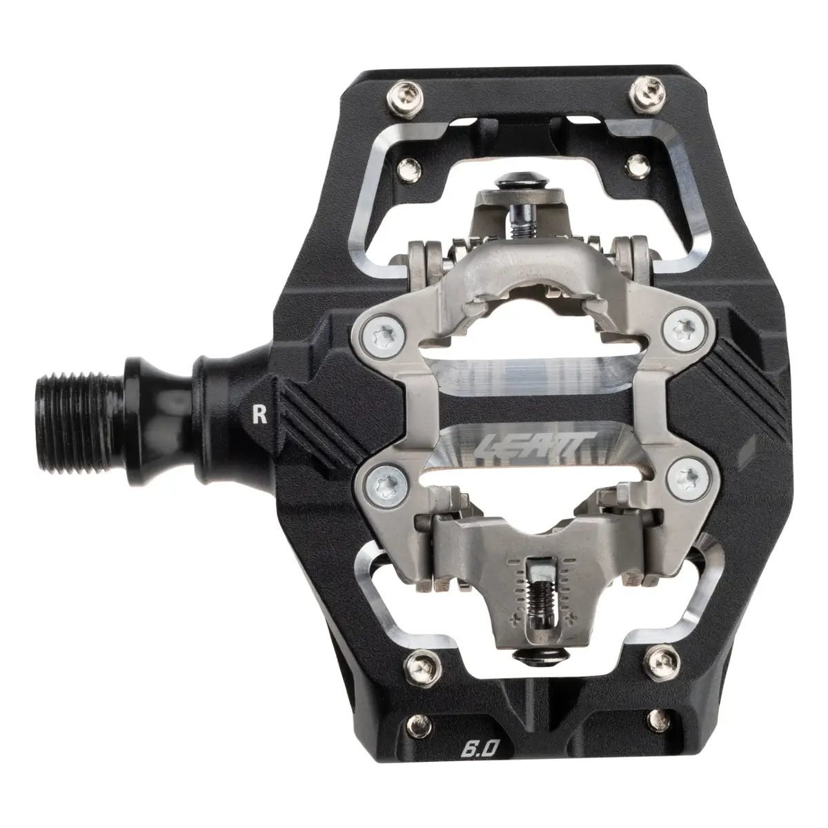 A Trail and All-Mtn clipless pedal body CNC-machined out of 6061-T6 aluminum. It utilizes an ultra-robust forged and CNC-machined chromoly steel axle. The fully serviceable triple-bearings system consists of a LSL self-lubricating bushing, a needle bearing, and an industrial roller bearing. Quad seals keep the internals remain dry in any conditions. The dual-sided clip-in system is compatible with classic SPD cleats. The retention system has an adjustable spring tension to finetune entry and relase, while offering 5 degrees of free float. The medium platform around the clip-in system provides a solid shoe support for power transfer, and the dropped front portions facilitate shoe entry. Four removable pins increase stability and traction in technical situations when disengaged from the pedal.