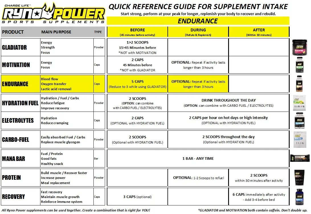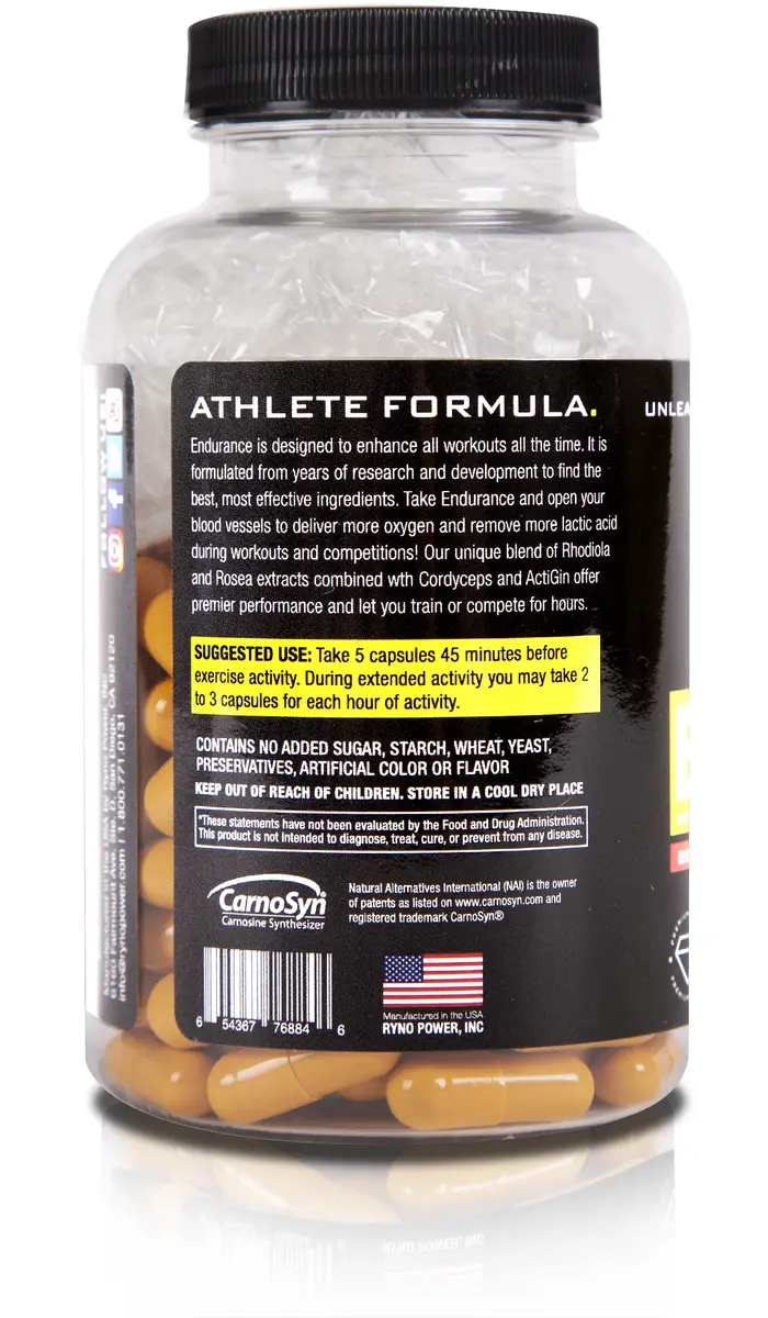 Ryno Power ENDURANCE is for all workouts, all the time. It is formulated from years of athlete testing in motocross and mountain biking to find the best & most effective ingredients, & eliminate those unnecessary and without benefit. Take ENDURANCE & open your blood vessels to deliver more oxygen while removing more lactic acid during your workouts, races, and competitions! Our unique blend of all natural Rhodiola Rosea extract & other proven & safe ingredients offers premiere performance & lets you train, race or compete for hours!