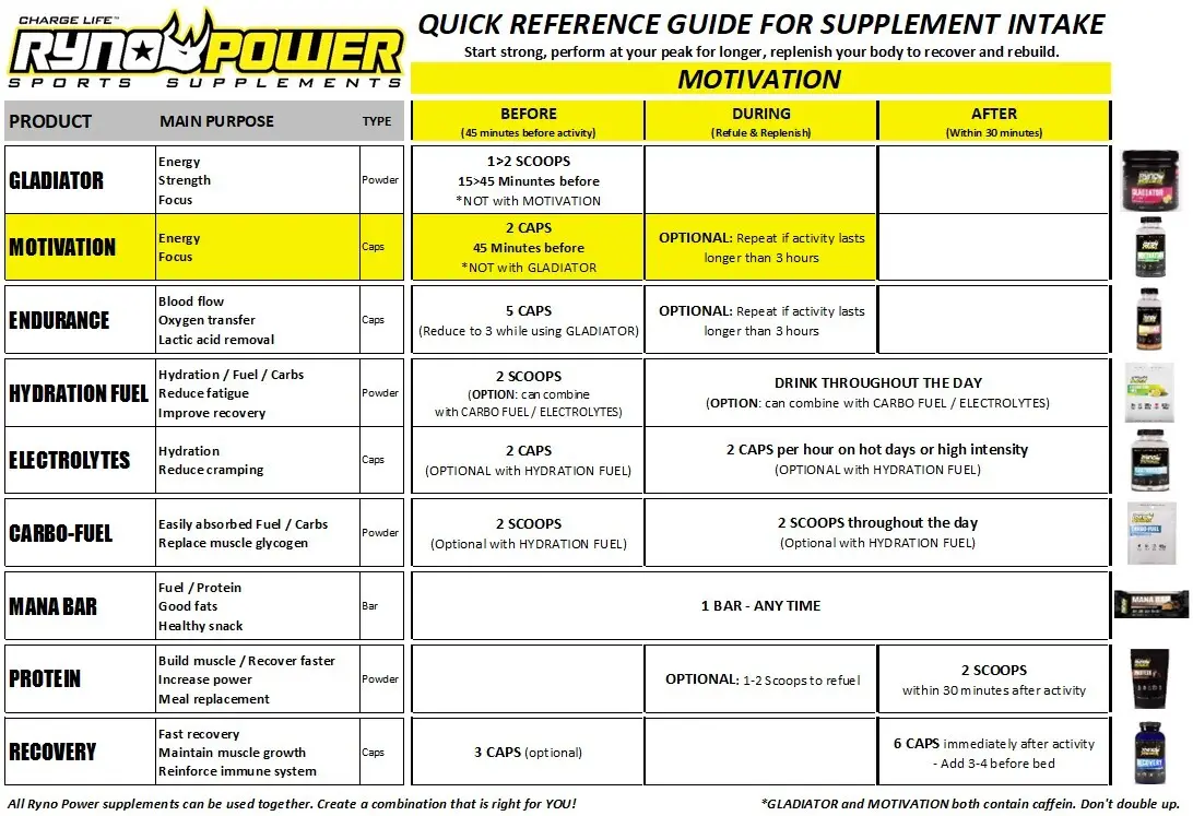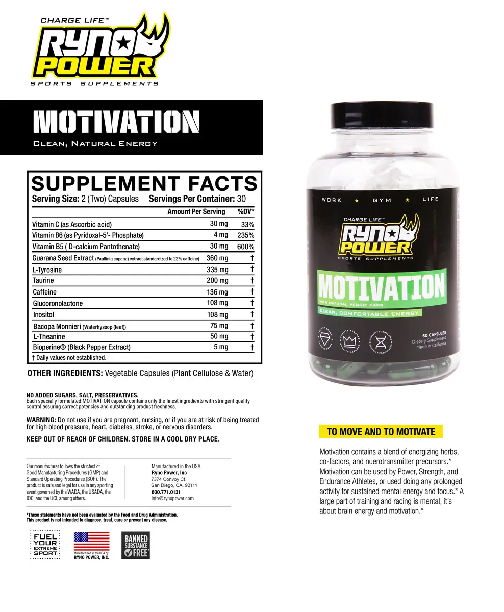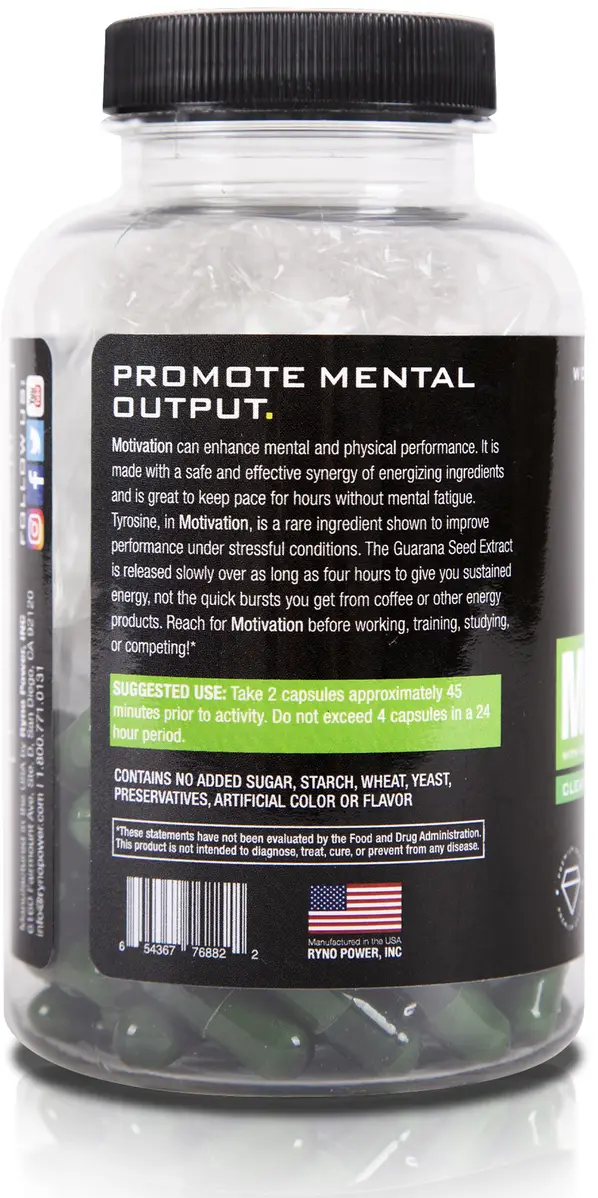 Enhance your mental and physical performance with MOTIVATION. It is made with a safe & effective synergy of natural energizing ingredients & is great to keep pace for hours without mental fatigue. Tyrosine is a rare but safe ingredient we use that is shown to improve performance under stressful conditions. The Guarana Seed Extract is released slowly over as long as four hours to give you sustained energy rather than the quick boost you get from coffee or other drinks. Our pro athletes love MOTIVATION for its natural formula that provides sustained energy without spikes or crashes.