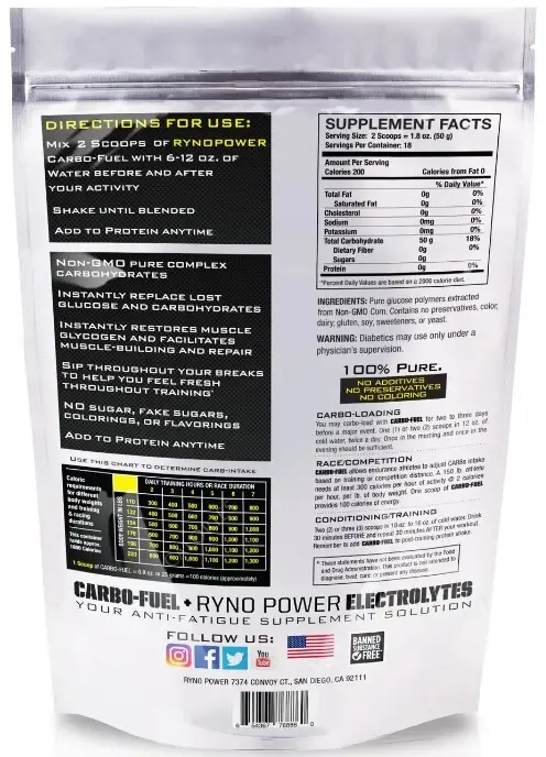 If protein, vitamins, & minerals are the building materials for your body, think of CARBO-FUEL as the gasoline for your body. CARBO-FUEL provides immediate & sustained energy along with recovery nutrition for all of your athletic needs whether it’s on your bike, on a run, or at the gym. Tasteless & colorless, it mixes easily in any juice or water. It works perfectly for carbo-loading before an event, as well as replacing muscle glycogen immediately after each training session. Take CARBO-FUEL 30-40 minutes before activity for lasting energy without being weighed down by a heavy meal from traditional carbo-loading. You will not want to workout another day without it!