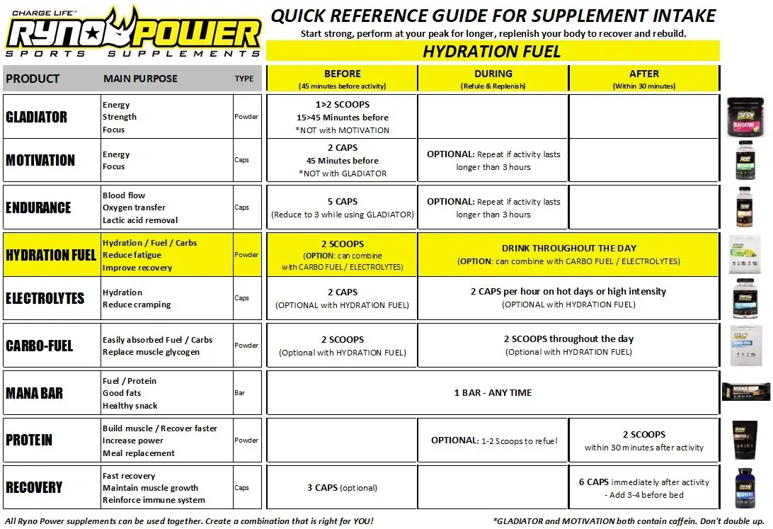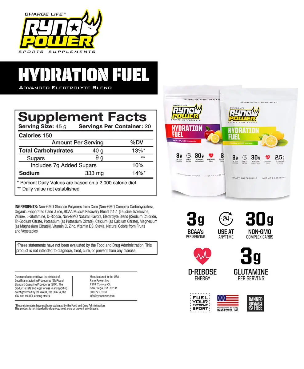 Fuel yourself like our Ryno Power pro athletes with this advanced electrolyte formula that will keep you going strong for hours! Whether you’re at the gym or on a ride, packed with BCAA's, Glutamine, Complex Carbohydrates, & D Ribose, this delicious drink makes every minute of training feel like your first. HYDRATION FUEL uses all-natural flavors, natural colors, & 100% organic sugar so it works great & is also extremely good for you too!
