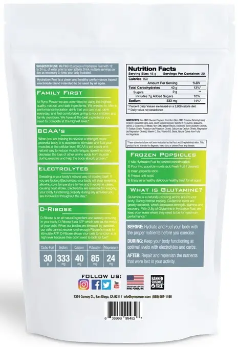 Fuel yourself like our Ryno Power pro athletes with this advanced electrolyte formula that will keep you going strong for hours! Whether you’re at the gym or on a ride, packed with BCAA's, Glutamine, Complex Carbohydrates, & D Ribose, this delicious drink makes every minute of training feel like your first. HYDRATION FUEL uses all-natural flavors, natural colors, & 100% organic sugar so it works great & is also extremely good for you too!